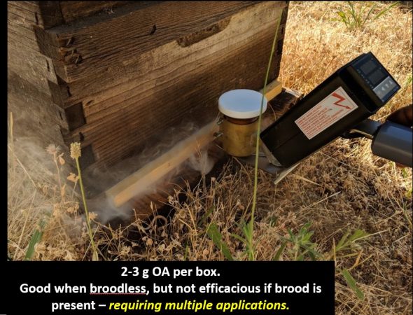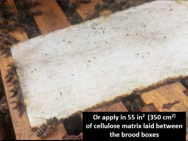 When broodless, 1-2 grams per brood chamber is efficacious. When brood is present, it requires at least three applications of 3 grams per brood chamber a week apart.