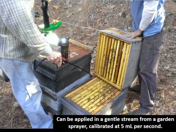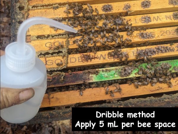 A syring is very difficult to use. Instead use a 250mL lab (aka tattoo) wash bottle. With a sharp knife, cut 1 mm (<1/16″) off the tip to enlarge the orifice. A gentle squeeze will dispense 5mL per second (calibrate yourself: it will take 3 seconds to fill 1 level Tablespoon). Then just squeeze up and down the frame interspaces (onto the bees, not the wood), counting “chimpanzee one, chimpanzee two,…). I takes 10 seconds to apply the treatment to a full box of bees.