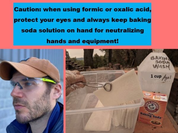 Oxalic dribble: Natural and safe (the amount of oxalic acid used is equivalent to that in a serving of spinach). This product is available at any hardware store as Wood Bleach (or 99.6% pure products on Amazon). Follow the mixing directions at https://scientificbeekeeping.com/oxalic-acid-treatment-table/ exactly, as there is only a small margin of safety to the bees. The oxalic syrup is very safe to handle, but care should be taken not to splash it into your eyes. The treatment is by far most effective if the colony is broodless. Best use is for a single application in November or December, as soon as there is no longer any sealed brood in the broodnest. Warning: repeated applications when there is brood present (such as during the summer) can set back the colony. On the other hand, a dribble is excellent for “cleaning up” nucs in the spring https://scientificbeekeeping.com/simple-early-treatment-of-nucs-against-varroa/.