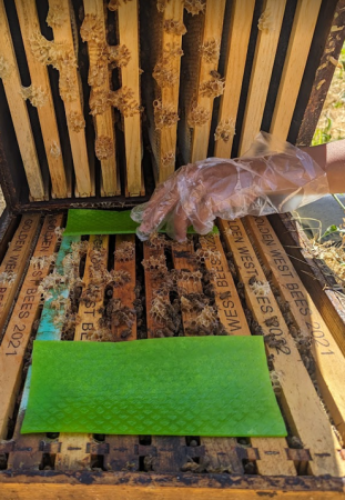 Applying a single MAQS. We use this for mite knock back while honey supers are still on. I prefer the new Formic Pro strips over MAQS.