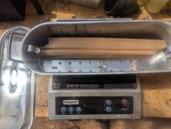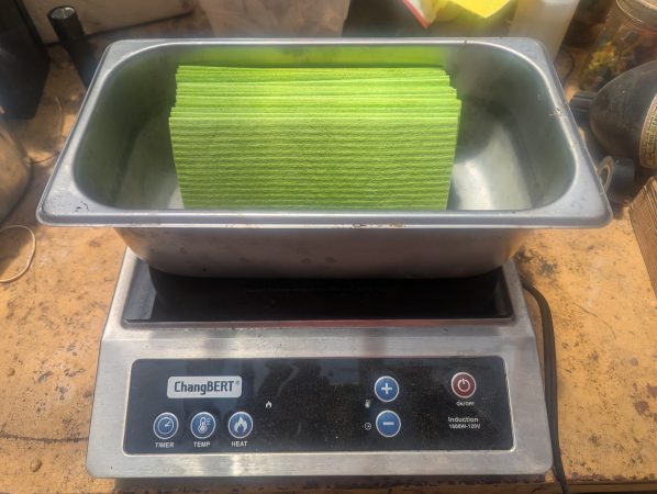 Once an OAE matrix has largely dispensed its OA, it needs to be pulled or scraped out of the hive, since the bees generally don’t remove them. The spent strips still contain some amount of OA, and need to be handled appropriately during disposal. Some pieces invariably fall on the ground, so I favor using biodegradable strips, so that we don’t leave non-biodegradable plastic pollution in our yards (the ShamWows may not fit this bill [[1]]).