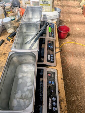 We put a lot of field work into this comparative trial of the diets. But this wasn’t just a test to see which subs were “best,” but rather an opportunity to learn why some diets perform better than others. At the grading in early November, I froze samples of workers vacuumed from the top bars of the broodnests. Vince and his technician Steven Tyler Williams performed weight and molecular analyses on the sampled bees, as well as sending samples of the patties out for nutritional analysis.