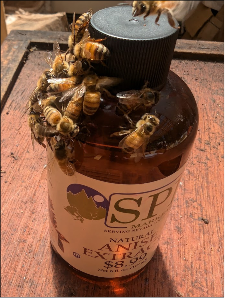 We ran our tests during our warm-to-hot September nectar dearth.  The bees would abandon the comb once they’d taken all the syrup.  But after the first training, investigators would quickly pick up the scent when we replenished the syrup, and call the gang back again.    Meanwhile, there would be plenty of anise-trained foragers seeking out any other source of anise scent (Figure 5).