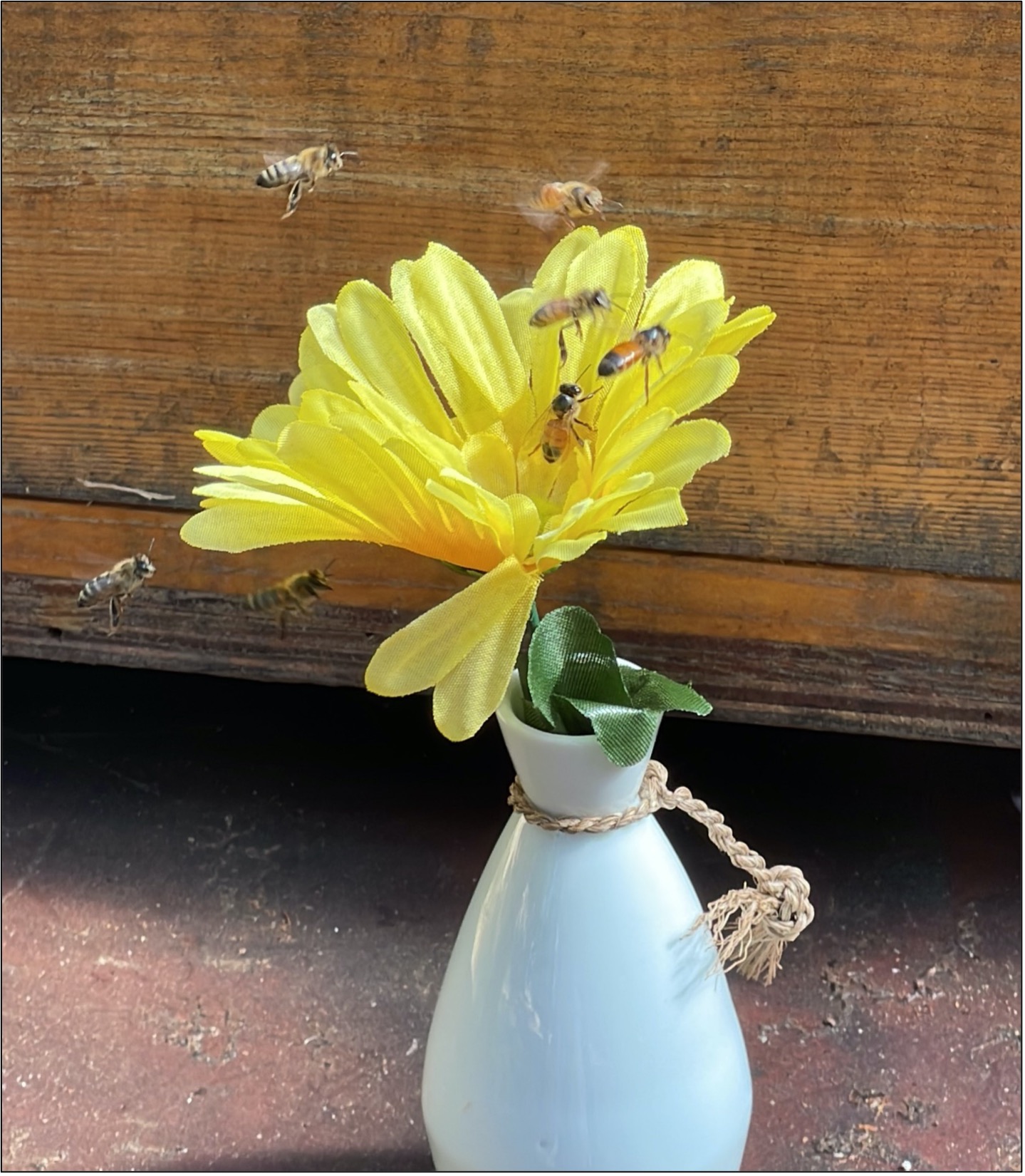 Fig. 8  Despite appearing surprisingly realistic, foragers paid no attention to the artificial flowers until we placed a drop of the anise scent to the center of the corolla.  Immediately plenty of (scent-trained) bees would be interested!  But they didn’t just land where we had placed the drop, but first engaged in the same sort of back-and-forth investigative flight that they did in front of the empty scented hives, only eventually working their way to the center (they quickly abandoned the flowers when they found no sugar reward).