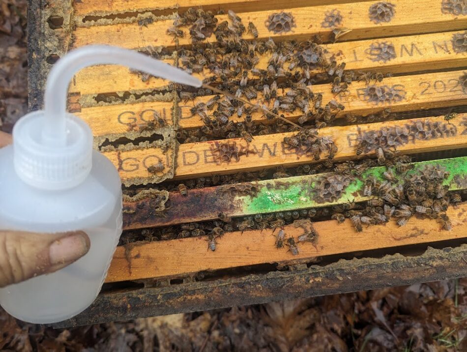 Fig. 3 It takes only seconds and pennies to eliminate most of the mites in broodless nucs if you hit them with an oxalic dribble on Day 18 [[4]] (we wait ‘til then to check for mate out).