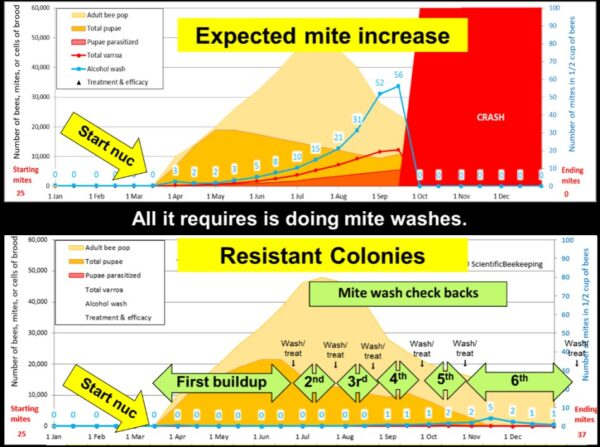 Fig. 8 Two simulations showing the difference between typical non-resistant colonies and resistant colonies. We wait at least 100 days to take our first mite wash, which allows the mite population to increase by 10-fold (or more) in non-resistant colonies.